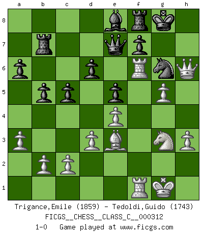 Last move : 1-0 2023 December 9 2:24:25 [Event "FICGS__CHESS__CLASS_C__000312"] [Site "FICGS"] [Date "2023.06.15"] [Round "1"] [White "Trigance,Emile"] [Black "Tedoldi,Guido"] [Result "1-0"] [WhiteElo "1859"] [BlackElo "1743"] 1.e4 c5 2.Nc3 Nc6 3.g3 d6 4.Bg2 e6 5.d3 h6 6.Be3 Nf6 7.f4 Be7 8.Nf3 O-O 9.O-O a6 10.h3 Rb8 11.g4 Bd7 12.Qe1 Nb4 13.Qf2 b5 14.g5 hxg5 15.Nxg5 Nh5 16.Bf3 g6 17.Bxh5 Bxg5 18.fxg5 gxh5 19.a3 Nc6 20.Qh4 Ne5 21.Qxh5 Qe7 22.Rf6 Ng6 23.Raf1 Be8 24.Ne2 e5 25.Ng3 Rb7 26.Qh6 1-0 Follow this game move after move (download)Chess is really ninety nine percent calculation. (Soltis) Spiel ein langweiliges Spiel zu Ende und lustige Dinge können passieren. (Hans Ree) Una mala movida nulifica cuarenta buenas. (Horowitz) Vous m'avez demandé de vous exposer quel est le fondement de la prière. Je ne fais que préparer les pièces du jeu sur la table... Nous sera-t-il permis d'en adopter les règles et si nous les appliquons scrupuleusement nous ne tarderons pas à faire mat le Roi divin ! Il ne pourra échapper à nos mains. (Sainte Thérèse d'Avila, Chemin de perfection) Children in the dark cause accidents, accidents in the dark cause children. (Unknown)