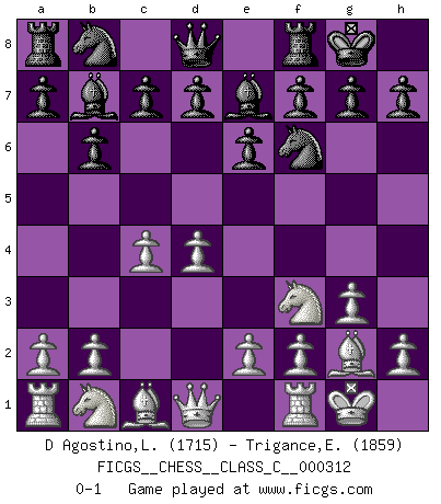 Last move : 0-1 2023 August 23 12:18:37 [Event "FICGS__CHESS__CLASS_C__000312"] [Site "FICGS"] [Date "2023.06.15"] [Round "1"] [White "D Agostino,Leonardo"] [Black "Trigance,Emile"] [Result "0-1"] [WhiteElo "1715"] [BlackElo "1859"] 1.d4 Nf6 2.c4 e6 3.Nf3 b6 4.g3 Bb7 5.Bg2 Be7 6.O-O O-O 0-1 This chess game has been lost on time (started : 2023.06.15 12:43:2) Follow this game move after move (download)Capture of the adverse King is the ultimate but not the first object of the game. (William Steinitz) Schach ist ein schwarz-weisser Dschungel. (Garry Kasparov) Tu cuerpo tiene que estar en óptima condición. Tu Ajedrez se deteriora como lo hace tu cuerpo. No puedes separar la mente y el cuerpo. (Bobby Fischer) Il a essayé de se convaincre qu'il pourrait empêcher toutes les erreurs et ne jamais perdre. L'horreur ! Gary Kasparov au sujet de Robert Fischer. The man who strikes first admits that his ideas have given out. (Chinese proverb)