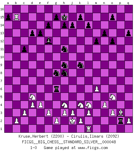 Last move : 1-0 2023 July 5 14:57:18 [Event "FICGS__BIG_CHESS__STANDARD_SILVER__000048"] [Site "FICGS"] [Date "2023.06.17"] [Round "1"] [White "Kruse,Herbert"] [Black "Cirulis,Ilmars"] [Result "1-0"] [WhiteElo "2200"] [BlackElo "2092"] 1.j2-k4 m15-m13 2.m2-m4 h15-g13 3.l1-p5 j15-k13 4.h1-o7 p16-o14 5.e2-e4 b16-c14 6.f1-b5 d15-d13 7.n2-n4 n15-n13 8.o1-f9 e15-e13 9.d2-d4 h16-m12 10.g1-f3 c16-k9 11.b1-c3 o16-g9 12.p1-o3 l16-p12 13.c1-l9 f16-b12 14.l9-k10 m12-n12 15.q1-n1 k16-h15 16.o7-n7 n12-n7 17.p5-n7 m13-m12 18.m1-m3 p12-l8 19.n7-l5 b12-f8 20.l5-g9 f8-g9 21.f9-g8 g13-h11 22.k10-q4 o14-m13 23.b5-c4 l15-l14 24.q4-p3 e16-e14 25.m3-l3 k13-j11 26.g8-j6 l8-j6 27.k4-j6 m16-m14 28.l3-l9 h15-j13 29.l9-p9 m14-p14 30.p9-o9 p14-o14 31.o9-o14 p15-o14 32.n1-n3 e14-f14 33.n3-k3 f14-f8 34.k3-k8 f8-k8 35.j6-k8 q16-p16 36.k1-l3 p16-p10 37.c4-b3 g16-j15 38.a2-a4 h11-j9 39.a4-a5 j13-h11 40.a5-a6 j15-h13 41.a1-a5 j16-j15 42.a5-b5 a16-b16 43.b5-b9 c14-d12 44.b3-a4 d12-f11 45.a4-d7 f11-h10 46.d7-f5 m13-l11 47.f5-k9 l11-k9 48.f3-h4 h10-g8 49.h2-g4 k9-h8 50.j1-j2 f15-f14 51.c3-d5 p10-p6 52.l3-j4 p6-a6 53.l2-l3 c15-c13 54.c2-c3 c13-c12 55.o3-n5 c12-c11 56.o2-o3 o14-o13 57.n5-l6 j11-k9 58.f2-f3 h13-j11 59.b9-b7 o13-o12 60.g4-j5 g9-h10 61.m4-m5 q15-q14 62.k8-m9 a6-a9 63.m9-o10 q14-q13 64.j4-k6 j11-h9 65.k6-j8 h10-j11 66.p3-o2 b16-p16 67.b7-b15 p16-p2 68.o2-p3 j15-h15 69.o10-n8 j11-g13 70.n8-m6 a9-a10 71.m6-o5 j9-l8 72.j5-l4 a10-j10 73.j8-k6 l8-k6 74.l4-k6 g13-d10 75.e1-l1 d10-e11 76.k6-l4 e11-c9 77.h4-k5 c9-f12 78.m5-m6 j10-j6 79.l6-k4 j6-g6 80.k5-h4 1-0 Follow this game move after move (download)Don't even mention losing to me. I can't stand to think of it. (Bobby Fischer) Ich glaube, ich kenne inzwischen die Gründe für mein Versagen: schachliche Charakterfehler. Ich war nie ein Wunderkind und in meiner gesamten menschlichen Entwicklung immer zu langsam. (Viktor Kortschnoi) El Ajedrez es de 30 a 40 por ciento psicología. Uno no cuenta con esto cuando se juega contra una computadora. No lo puedo confundir. (Judith Polgar) Seul un grand joueur sait à quel point il joue faiblement. (Xavier Tartacover) I just play for fun. (Anna Kournikova)