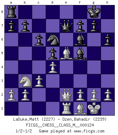 Last move : 1/2-1/2 2023 July 25 20:34:23 [Event "FICGS__CHESS__CLASS_M__000124"] [Site "FICGS"] [Date "2023.06.23"] [Round "1"] [White "LaDuke,Matt"] [Black "Ozen,Bahadir"] [Result "1/2-1/2"] [WhiteElo "2227"] [BlackElo "2239"] 1.e4 e5 2.Nf3 Nc6 3.Bb5 Nf6 4.O-O Nxe4 5.Re1 Nd6 6.Nxe5 Be7 7.Bf1 Nxe5 8.Rxe5 O-O 9.d4 Bf6 10.Re1 Re8 11.c3 Rxe1 12.Qxe1 Ne8 13.Bf4 d5 14.Nd2 Bf5 15.Qe2 c6 16.Re1 h6 17.Nb3 Nd6 18.Be5 Qe7 19.Bf4 Qd8 20.Be5 Qe7 1/2-1/2 Follow this game move after move (download)Examine moves that smite! A good eye for smites is far more important than a knowledge of strategical principles. (Purdy) Warum muß ich gegen diesen IDIOTEN verlieren? (Aaron Nimzowitsch) Dejen al perfeccionista jugar por correo. (Yasser Seirawan) Les échecs, c'est l'imagination. (David Bronstein) If we knew what we were doing, we would not call it research. (Albert Einstein)