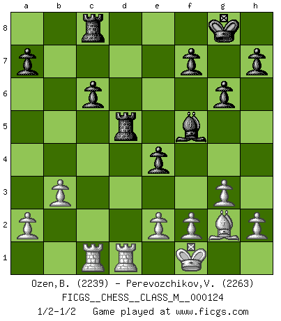 Last move : 1/2-1/2 2023 September 10 22:37:45 [Event "FICGS__CHESS__CLASS_M__000124"] [Site "FICGS"] [Date "2023.06.23"] [Round "1"] [White "Ozen,Bahadir"] [Black "Perevozchikov,Vjacheslav"] [Result "1/2-1/2"] [WhiteElo "2239"] [BlackElo "2263"] 1.Nf3 Nf6 2.g3 g6 3.Bg2 Bg7 4.d4 d5 5.c4 c6 6.cxd5 cxd5 7.O-O O-O 8.Nc3 Nc6 9.Ne5 Bf5 10.Nxc6 bxc6 11.Bf4 Rc8 12.Rc1 Re8 13.Qd2 Ne4 14.Nxe4 dxe4 15.Be3 e5 16.dxe5 Qxd2 17.Bxd2 Rxe5 18.b3 Rd5 19.Be3 Bd4 20.Bf4 Be5 21.Bxe5 Rxe5 22.Rfd1 Rd5 23.Kf1 1/2-1/2 Follow this game move after move (download)By this measure (on the gap between Fischer & his contemporaries), I consider him the greatest world champion. (Garry Kasparov) Wer mein Gambit spielt, muß bereit sein, alle Brücken hinter sich abzubrechen. Es verändert den ganzen Menschen. Es wirkt wie ein Zauberstab und fördert verkümmerte, gute Charakter- eigenschaften wieder zu Tage. (Emil Joseph Diemer) Me gusta decir que Bobby Fischer fue el mejor jugador que jamás haya existido. Pero lo que hizo de Fischer un genio, fue su habilidad de mezclar una frescura y pragmatismo Americano con ideas Rusas acerca de la estrategia. (Bruce Pandolfini) Toute estimation doit être constamment réévaluée. (Jacob Estrin) If only people were all showed a certain minimum level of niceness; if only people didn't retract verbal draw offers (without draw box ticked) on ficgs; if only people didn't kill; if only people didn't run concentration / extermination camps, if only people didn't drop nuclear bombs on Hiroshima and Nagasaki, and so on - it would be a much more beautiful world. But sadly, things are not so... (Normajean Yates)