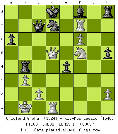 Last move : 1-0 2008 January 12 6:53:4 [Event "FICGS__CHESS__CLASS_D__000057"] [Site "FICGS"] [Date "2007.09.01"] [Round "1"] [White "Cridland,Graham"] [Black "Kis-Kos,Laszlo"] [Result "1-0"] [WhiteElo "1524"] [BlackElo "1546"] 1.e4 c5 2.Nf3 d6 3.d4 cxd4 4.Nxd4 Nf6 5.Nc3 a6 6.Bg5 e6 7.f4 Be7 8.Qf3 Qc7 9.O-O-O Nbd7 10.g4 b5 11.Bxf6 Nxf6 12.g5 Nd7 13.f5 Nc5 14.f6 gxf6 15.gxf6 Bf8 16.Rg1 h5 17.a3 Rb8 18.Bh3 b4 19.axb4 Rxb4 20.Rg7 Qb7 21.b3 Qb6 22.Nd5 exd5 23.Bxc8 dxe4 24.Qc3 d5 25.Nf5 Qc7 26.Kb1 Rb8 27.Bd7+ Kd8 28.Rxf7 Nxd7 29.Qd4 Rb4 30.Qxd5 1-0 Comment by player 1 : Graham Cridland : An interesting game marred by a few serious late innaccuracies by both sides. I vote for it primarily on the basis of 27 Bd7+! which looks absurd at first glance but is nonetheless, best. 24 Qc3?! looks nice but does very little; Black even gets to leave his Rook hanging due to tactical problems. I expected 23 ... Rxd4 rather than ... dxe4. Sicilian : Najdorf, 7...Be7 Queenside Castling by player White (move 9) Player White won this chess game. Follow this game move after move (download)My God, Bobby Fischer plays so simply. (Alexei Suetin) Ich glaube, ich kenne inzwischen die Gründe für mein Versagen: schachliche Charakterfehler. Ich war nie ein Wunderkind und in meiner gesamten menschlichen Entwicklung immer zu langsam. (Viktor Kortschnoi) El Ajedrez es de 30 a 40 por ciento psicología. Uno no cuenta con esto cuando se juega contra una computadora. No lo puedo confundir. (Judith Polgar) Seul un grand joueur sait à quel point il joue faiblement. (Xavier Tartacover) No enterprise is more likely to succeed than one concealed from the enemy until it is ripe for execution. (Niccolo Machiavelli)
