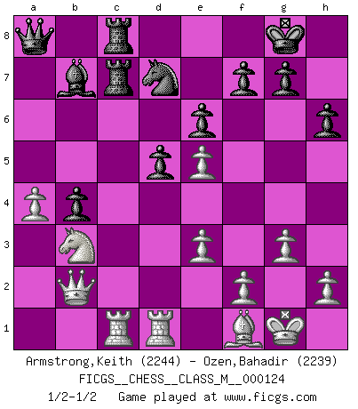 Last move : 1/2-1/2 2023 August 24 4:26:52 [Event "FICGS__CHESS__CLASS_M__000124"] [Site "FICGS"] [Date "2023.06.23"] [Round "1"] [White "Armstrong,Keith"] [Black "Ozen,Bahadir"] [Result "1/2-1/2"] [WhiteElo "2244"] [BlackElo "2239"] 1.Nf3 d5 2.d4 Nf6 3.c4 e6 4.g3 Bb4+ 5.Bd2 Be7 6.Bg2 O-O 7.O-O c6 8.b3 b6 9.Qc2 Nbd7 10.Rd1 h6 11.Bc3 Bb7 12.Nbd2 Qc7 13.Rac1 Rac8 14.Qb2 Qb8 15.Ne5 Nxe5 16.dxe5 Nd7 17.b4 Rc7 18.e3 Rfc8 19.Bf1 Qa8 20.a4 a5 21.bxa5 bxa5 22.Nb3 Bb4 23.Bxb4 axb4 24.cxd5 cxd5 1/2-1/2 Follow this game move after move (download)The only thing Chess players have in common is Chess. (Lodewijk Prins) Der Schachmeister von Heute braucht Courage, einen Killerinstinkt, Ausdauer und Arroganz. (Larry Evans) De todos mis libros Rusos, la defensa contiene y difunde el 'calor' mas grande que pudiese verse extraño al observar lo supremamente abstracto que el Ajedrez supuestamente es. (Vladimir Nabokov) Les Echecs ne sont pas pour les âmes timides. Ils requièrent un homme entier, qui ne s'arrête pas aveuglément à ce qui a été déjà établi, mais qui tente individuellement de sonder les profondeurs du jeu. (W. Steinitz) If you ain't just a little scared when you enter a casino, you are either very rich or you haven't studied the games enough. (Pappy)