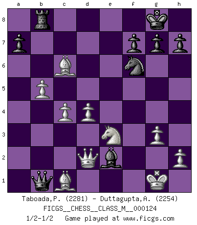 Last move : 1/2-1/2 2023 September 13 20:9:41 [Event "FICGS__CHESS__CLASS_M__000124"] [Site "FICGS"] [Date "2023.06.23"] [Round "1"] [White "Taboada,Pedro Pablo"] [Black "Duttagupta,Aniruddha"] [Result "1/2-1/2"] [WhiteElo "2281"] [BlackElo "2254"] 1.c4 e5 2.g3 c6 3.Bg2 d5 4.cxd5 cxd5 5.d4 e4 6.Nc3 Bb4 7.Nh3 Nf6 8.O-O O-O 9.f3 exf3 10.Rxf3 Bxc3 11.bxc3 Bg4 12.Rxf6 Qxf6 13.Nf4 Nd7 14.Nxd5 Qd8 15.Rb1 Re8 16.Ne3 Bh5 17.Rxb7 Rb8 18.Rb3 Nf6 19.c4 Rxb3 20.axb3 Qa5 21.Qd2 Qa1 22.Bc6 Rb8 23.b4 Qb1 24.b5 Bxe2 25.Qb2 Qd3 26.Qd2 Qb1 1/2-1/2 Follow this game move after move (download)Suddenly it was obvious to me in my analysis I had missed what Fischer had found with the greatest of ease at the board. (Mikhail Botvinnik) Die unerbitterlichsten Regeln im Schach sind die Ausnahmen. (Savielly Grigorievitsch Tartakower) Nada excita más a Grandes Maestros aburridos que una novedad teórica. (Dominic Lawson) Vous n'êtes pas toujours obligé de jouer le meilleur coup. Un coup doit être actif, entreprenant, correct et beau ! (David Bronstein) O divine art of subtlety and secrecy! Through you we learn to be invisible, through you inaudible and hence we can hold the enemy's fate in our hands. (Sun Tzu)