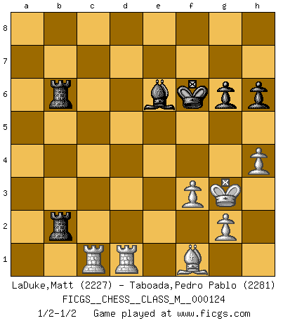 Last move : 1/2-1/2 2023 October 3 20:34:34 [Event "FICGS__CHESS__CLASS_M__000124"] [Site "FICGS"] [Date "2023.06.23"] [Round "1"] [White "LaDuke,Matt"] [Black "Taboada,Pedro Pablo"] [Result "1/2-1/2"] [WhiteElo "2227"] [BlackElo "2281"] 1.e4 e5 2.Nf3 Nc6 3.Bb5 a6 4.Ba4 Nf6 5.O-O Be7 6.Re1 b5 7.Bb3 O-O 8.c3 d6 9.h3 Bb7 10.d4 Re8 11.a3 Bf8 12.Nbd2 h6 13.Bc2 Nb8 14.b3 Nbd7 15.Bb2 Rb8 16.Rb1 g6 17.b4 Ba8 18.Bd3 c6 19.a4 Nh5 20.axb5 axb5 21.Ba1 Bg7 22.dxe5 Nxe5 23.Nxe5 dxe5 24.Bf1 c5 25.bxc5 Qe7 26.Nb3 Nf4 27.Qc2 Ne6 28.Bb2 Qc7 29.Ba3 Bf8 30.Qd3 Rec8 31.Qe3 Kg7 32.f3 Nxc5 33.Bxc5 Bxc5 34.Nxc5 Qxc5 35.Qxc5 Rxc5 36.Re3 Rb7 37.Kf2 Kf6 38.Ra1 Rc8 39.Ra6+ Ke7 40.Ra5 Rcb8 41.c4 bxc4 42.Rxe5+ Kf6 43.Rc5 Rb2+ 44.Kg3 R8b3 45.Re1 c3 46.e5+ Kg7 47.e6 fxe6 48.Rxe6 Rb6 49.Re7+ Kf6 50.Ra7 Bc6 51.Rxc3 Bd5 52.h4 Ra2 53.Rd7 Be6 54.Rd1 Rab2 55.R3c1 1/2-1/2 Follow this game move after move (download)Every Chess master was once a beginner. (Chernev) Vielleicht wirkt die Aura früherer Spieler glanzvoller als die der heutigen Spieler, aber das liegt daran, dass man kein Programm wie Fritz hatte, das einem all die Löcher in ihren Partien zeigt. (Vladimir Kramnik) Debió haber existido una vez en que los hombres eran semidióses, de otra manera no hubiesen podido inventar el Ajedrez. (Gustav Schenk) On peut tirer plus d'utilité d'une partie perdue que de 100 parties gagnées. (Capablanca) Don't anthropomorphize computers - they hate it. (Anonymous)
