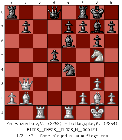 Last move : 1/2-1/2 2023 September 4 22:10:41 [Event "FICGS__CHESS__CLASS_M__000124"] [Site "FICGS"] [Date "2023.06.23"] [Round "1"] [White "Perevozchikov,Vjacheslav"] [Black "Duttagupta,Aniruddha"] [Result "1/2-1/2"] [WhiteElo "2263"] [BlackElo "2254"] 1.Nf3 Nf6 2.g3 g6 3.Bg2 Bg7 4.O-O O-O 5.c4 c6 6.b3 Ne4 7.d4 d5 8.Bb2 a5 9.Nc3 Nxc3 10.Bxc3 Nd7 11.Rc1 Nb6 12.Bb2 a4 13.cxd5 axb3 14.Qxb3 Nxd5 15.e4 Nf6 16.Rfe1 Be6 17.d5 cxd5 18.Ng5 Nxe4 1/2-1/2 Follow this game move after move (download)Chess, like any creative activity, can exist only through the combined efforts of those who have creative talent, and those who have the ability to organize their creative work. (Mikhail Botvinnik) Ein Buch ist ein Spiegel; wenn ein Affe hineinsieht, so kann kein Apostel heraus gucken. (Georg Christoph Lichtenberg) Un Peón pasado aumenta su poder a medida de que el número de piezas en el tablero disminuye. (Capablanca) Toutes les manuvres exécutées sur une colonne ouverte ont pour but ultime l'intrusion définitive sur la septième ou la huitième rangée, en plein cur de la position ennemie. (Aaron Nimzovitch) Fame, I have already. Now I need the money. (an elderly Steinitz)