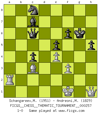 Last move : 1-0 2023 August 14 21:39:4 [Event "FICGS__CHESS__THEMATIC_TOURNAMENT__000257"] [Site "FICGS"] [Date "2023.06.23"] [Round "1"] [White "Schangareev,Mirzian"] [Black "Andreoni,Mario"] [Result "1-0"] [WhiteElo "1951"] [BlackElo "1829"] 1.Nf3 d5 2.b4 Qd6 3.c4 dxc4 4.e3 Qxb4 5.Na3 c3 6.Rb1 cxd2+ 7.Nxd2 Qd6 8.Nac4 Qd8 9.Na5 c6 10.Nxb7 Qc7 11.Nc5 Nf6 12.Bb2 e5 13.Qc2 Be7 14.Be2 O-O 15.O-O Nbd7 16.Na6 Bxa6 17.Bxa6 Rab8 18.Rfd1 Nc5 19.Bc4 Rfd8 20.Nb3 Rxd1+ 21.Rxd1 g6 22.Nxc5 Bxc5 23.Bb3 Bd6 24.h3 a5 25.Ba1 Nd5 26.h4 Rb4 27.h5 Rh4 28.hxg6 hxg6 29.Rc1 Ne7 30.Qd3 a4 31.g3 axb3 32.gxh4 bxa2 33.e4 c5 34.Rd1 Nc8 35.Kg2 Kf8 36.Rd2 Qc6 37.Rxa2 c4 38.Qb1 Bc7 39.f3 f6 40.Bc3 Kf7 41.h5 gxh5 42.Qh1 Kg6 43.Kf1 1-0 Follow this game move after move (download)Daring ideas are like Chess men moved forward. They may be beaten, but they may start a winning game. (Johann Wolfgang von Goethe) Die Auseinandersetzung mit Karpow war politisch geprägt. Er stand für das kommunistische System, wurde von dessen Repräsentanten gehätschelt. Ich war der Oppositionelle. Jeder Schachweltmeister spiegelt auch die gesellschaftlichen Verhältnisse wider. Kramnik steht für die Börsen-Generation des Neuen Markts, ideologiefrei, zahlenfixiert. (Garry Kasparov) El Ajedrez es sobre todo, ¡una pelea!. (Emanuel Lasker) Les Echecs ne sont pas pour les âmes timides. Ils requièrent un homme entier, qui ne s'arrête pas aveuglément à ce qui a été déjà établi, mais qui tente individuellement de sonder les profondeurs du jeu. (W. Steinitz) Your best chance to get a Royal Flush in a casino is in the bathroom. (Anonymous)