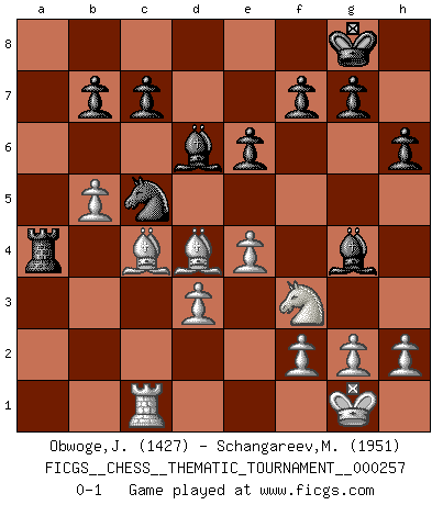 Last move : 0-1 2023 October 21 0:35:45 [Event "FICGS__CHESS__THEMATIC_TOURNAMENT__000257"] [Site "FICGS"] [Date "2023.06.23"] [Round "1"] [White "Obwoge,Joseph"] [Black "Schangareev,Mirzian"] [Result "0-1"] [WhiteElo "1427"] [BlackElo "1951"] 1.Nf3 d5 2.b4 Bf5 3.e3 e6 4.Bb2 Nf6 5.b5 a6 6.a4 Nbd7 7.Be2 axb5 8.axb5 Rxa1 9.Bxa1 Qa8 10.Bb2 Bd6 11.O-O h6 12.c4 dxc4 13.Bxc4 Nb6 14.Be2 Qa4 15.Qxa4 Nxa4 16.Bd4 O-O 17.Nc3 Nxc3 18.Bxc3 Ne4 19.Bd4 Ra8 20.Rc1 Ra2 21.Bc4 Ra4 22.d3 Nc5 23.e4 Bg4 0-1 Follow this game move after move (download)The hardest game to win is a won game. (Emanuel Lasker) Ich bin der einzige Schachspieler, der sich während der Vorbereitungen zum Turnier verletzt hat. (Woody Allen) Una clavada es mas poderosa que una espada. (Fred Reinfeld) Comme les marins qui ont mille raisons différentes d'aller en mer, les joueurs d'échecs en ont tout autant avant de s'installer devant une table et jouer... (Vincent Bertignac, philosophe) When you have everything, sometimes it feels like nothing. (Horatio Caine, C.S.I. Miami)