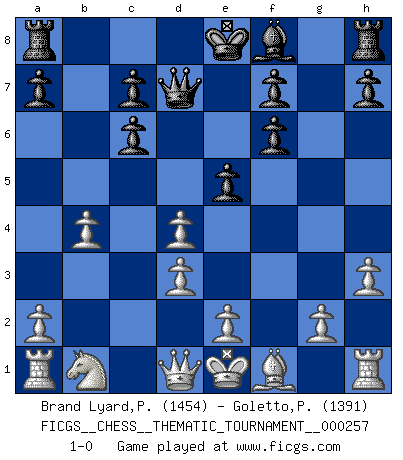 Last move : 1-0 2023 September 20 13:18:30 [Event "FICGS__CHESS__THEMATIC_TOURNAMENT__000257"] [Site "FICGS"] [Date "2023.06.23"] [Round "1"] [White "Brand Lyard,Paul"] [Black "Goletto,Piero Giuseppe"] [Result "1-0"] [WhiteElo "1454"] [BlackElo "1391"] 1.Nf3 d5 2.b4 Bg4 3.d3 Nf6 4.Ne5 Nc6 5.Nxc6 bxc6 6.f3 e5 7.fxg4 Nxg4 8.h3 Nf6 9.Bg5 Qd7 10.Bxf6 gxf6 11.c3 d4 12.cxd4 1-0 This chess game has been lost on time (started : 2023.06.23 21:4:33) Follow this game move after move (download)Of all my Russian books, the defense contains and diffuses the greatest 'warmth' which may seem odd seeing how supremely abstract Chess is supposed to be. (Vladimir Nabokov) Schach wird sich dank seiner hohen kulturellen Tradition immer durchsetzen. In näherer Zukunft womöglich sogar als Gegenreaktion auf die maßlose Reizüberflutung im Freizeit- und Spielbereich. (Garry Kasparov) Muchos se han convertido en Maestros de Ajedrez, nadie se ha convertido en el Maestro del Ajedrez. (Siegbert Tarrasch) La conception d'un plan est le processus par lequel un joueur exploite les avantages de sa position tout en s'efforçant d'en réduire au minimum les inconvénients. Afin de garantir le succès, un plan doit toujours se fonder sur un diagnostic objectif des particularités d'une position. La conception d'un plan est d'autant plus difficile que la position est équilibrée, et grandement facilitée lorsqu'il n'existe qu'un seul plan susceptible de répondre aux exigences de la position. (Harry Golombek) The question of whether computers can think is just like question of whether submarines can swim. (Edsger W. Dijkstra)