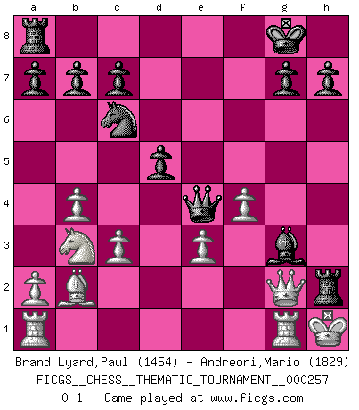 Last move : 0-1 2023 July 18 17:51:53 [Event "FICGS__CHESS__THEMATIC_TOURNAMENT__000257"] [Site "FICGS"] [Date "2023.06.23"] [Round "1"] [White "Brand Lyard,Paul"] [Black "Andreoni,Mario"] [Result "0-1"] [WhiteElo "1454"] [BlackElo "1829"] 1.Nf3 d5 2.b4 Qd6 3.c3 e5 4.e3 e4 5.Ng1 Nh6 6.d4 exd3 7.Bxd3 Bf5 8.Bxf5 Nxf5 9.Nf3 Be7 10.O-O O-O 11.Nbd2 Bf6 12.g4 Nh4 13.Nxh4 Bxh4 14.Nb3 f5 15.gxf5 Rxf5 16.f4 Qg6+ 17.Kh1 Nc6 18.Qd2 Rh5 19.Bb2 Bg3 20.Rg1 Qe4+ 21.Qg2 Rxh2+ 0-1 Follow this game move after move (download)Chess is mental torture. (Garry Kasparov) Mein Name ist Rustam Kamsky. Sie haben meinen Sohn belästigt. Bereiten Sie sich aufs Sterben vor. (Rustam Kamsky) La batalla por la última verdad nunca sera ganada. Y es por eso que el Ajedrez es tan fascinante. (Hans Kmoch) Aux échecs, les retours au sommet sont rares : les dommages psychologiques consécutifs à une défaite sont trop sévères. (Daily Telegraph) There are lots of people who mistake their imagination for their memory. (Josh Bilings)