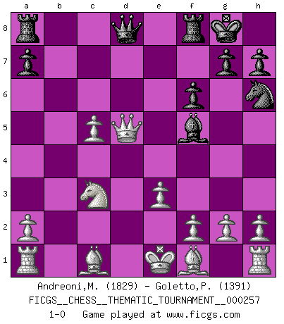 Last move : 1-0 2023 September 19 12:5:5 [Event "FICGS__CHESS__THEMATIC_TOURNAMENT__000257"] [Site "FICGS"] [Date "2023.06.23"] [Round "1"] [White "Andreoni,Mario"] [Black "Goletto,Piero Giuseppe"] [Result "1-0"] [WhiteElo "1829"] [BlackElo "1391"] 1.Nf3 d5 2.b4 c5 3.bxc5 Nc6 4.d4 Bf5 5.e3 e5 6.Nxe5 f6 7.Nxc6 bxc6 8.c4 Bxc5 9.dxc5 Nh6 10.Nc3 O-O 11.cxd5 cxd5 12.Qxd5+ 1-0 This chess game has been lost on time (started : 2023.06.23 21:4:33) Follow this game move after move (download)Half the variations which are calculated in a tournament game turn out to be completely superfluous. Unfortunately, no one knows in advance which half. (Jan Tinman) Über Karpov: Er war und ist ein Vertreter der russischen Reaktionäre. Das steckt tief in seiner Seele, wehalb ich nicht nett mit ihm umgehen kann. (Viktor Kortschnoi) El Ajedrez es tan interesante por sí solo, que no es necesario un interés monetario para persuadir a una persona a que lo practique; por lo tanto, nunca se juega por dinero. (Benjamin Franklin) Il n'y a pas de prix trop élevé au scalp de l'ennemi. (Koblentz) Creativity is allowing yourself to make mistakes. Art is knowing which ones to keep. (Scott Adams)