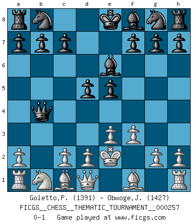 Last move : 0-1 2023 August 16 22:56:37 [Event "FICGS__CHESS__THEMATIC_TOURNAMENT__000257"] [Site "FICGS"] [Date "2023.06.23"] [Round "1"] [White "Goletto,Piero Giuseppe"] [Black "Obwoge,Joseph"] [Result "0-1"] [WhiteElo "1391"] [BlackElo "1427"] 1.Nf3 d5 2.b4 Bg4 3.Nh4 e5 4.f3 Be6 5.e3 Qxh4 6.Ke2 Qxb4 0-1 This chess game has been lost on time (started : 2023.06.23 21:4:33) Follow this game move after move (download)Modern Chess is too much concerned with things like Pawn structure. Forget it, Checkmate ends the game. (Nigel Short) Wenn Schach ein enormer Dschungel ist, der seine Myriaden von Geheimnissen nicht preisgeben will, dann sind Computer die Kettensägen einer gewaltigen ökologisch unsensiblen Nutzholzfirma. (Nigel Short) Yo nunca en mi vida he jugado la Defensa Francesa, que viene siendo la más aburrida de todas las Aperturas. (Wilhelm Steinitz) Donnez-moi un Cavalier en 6e et je gagnerais toutes mes parties. (Steinitz) A generalist learns less and less about more and more until he knows nothing about everything. (Author unknown)