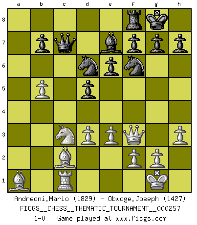 Last move : 1-0 2023 September 18 23:48:1 [Event "FICGS__CHESS__THEMATIC_TOURNAMENT__000257"] [Site "FICGS"] [Date "2023.06.23"] [Round "1"] [White "Andreoni,Mario"] [Black "Obwoge,Joseph"] [Result "1-0"] [WhiteElo "1829"] [BlackElo "1427"] 1.Nf3 d5 2.b4 Bg4 3.Bb2 Nf6 4.e3 e6 5.b5 a6 6.a4 Be7 7.c4 c6 8.h3 Bxf3 9.Qxf3 axb5 10.cxb5 O-O 11.Bd3 Nbd7 12.O-O Nc5 13.Bc2 cxb5 14.axb5 Rxa1 15.Bxa1 Nce4 16.d3 Nd6 17.Nc3 Qc7 18.Rc1 1-0 This chess game has been lost on time (started : 2023.06.23 21:4:33) Follow this game move after move (download)Could we look into the head of a Chess player, we should see there a whole world of feelings, images, ideas, emotion and passion. (Alfred Binet) Intelligenz läßt sich nicht am Weg, sondern nur am Ergebnis feststellen. (Garry Kasparov) No nos podemos resistir a la fascinación de un sacrificio ya que la pasión por los sacrificios es parte de la naturaleza de un jugador de Ajedrez. (Rudolf Spielman) Botvinnik disait en comparant les échecs à la musique: Il existe une science dont le but est l'étude de l'acoustique et des sons. Mais il y a aussi un art qui se sert de l'océan des sons : c'est la musique. De toute évidence, il en est de même pour la pensée. La logique est l'étude des lois de la réflexion et les échecs reflètent, en tant qu'art, le côté logique de la réflexion, sous la forme d'images artistiques... Extrait de Fischer - Spassky, Reykjavik 1972 par Alexander & F. Wyndham (Ed. Solar), p 37. It's not the will to win, but the will to prepare to win that makes the difference. (Bear Bryant)