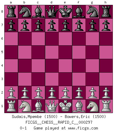 Last move : 0-1 2023 July 26 4:31:55 [Event "FICGS__CHESS__RAPID_C__000297"] [Site "FICGS"] [Date "2023.06.25"] [Round "1"] [White "Sudais,Mpembe"] [Black "Bowers,Eric"] [Result "0-1"] [WhiteElo "1500"] [BlackElo "1500"] 0-1 This chess game has been lost on time (started : 2023.06.25 16:59:19) Follow this game move after move (download)Fischer prefers to enter Chess history alone. (Miguel Najdorf) Ich möchte Schüler heranbilden, die das Vermögen haben, selbst zu denken und Kritik zu üben. (Emanuel Lasker) Repentinamente, me resultaba obvio en mi analisis que yo había pasado por alto lo que Fischer había visto en el tablero con la mas grande facilidad. (Mikhail Botvinnik) On est toujours la mazette de quelqu'un d'autre. (Anonyme) Unless I accept my faults I will most certainly doubt my virtues. (Hugh Prather)