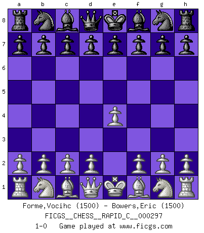 Last move : 1-0 2023 July 27 7:22:18 [Event "FICGS__CHESS__RAPID_C__000297"] [Site "FICGS"] [Date "2023.06.25"] [Round "1"] [White "Forme,Vocihc"] [Black "Bowers,Eric"] [Result "1-0"] [WhiteElo "1500"] [BlackElo "1500"] 1.e4 1-0 This chess game has been lost on time (started : 2023.06.25 16:59:19) Follow this game move after move (download)There is no remorse like the remorse of Chess. (H. G. Wells) Der Verteidiger gebe der Gewalt nach, aber nur der Gewalt. Er schaffe sich nicht freiwillig, etwa aus Blindheit oder aus Schrecken, irgendwelche Schwächen. Er lasse sich nicht bluffen. (Emanuel Lasker) Hasta este punto, las blancas han seguido un análisis bien conocido. Pero ahora el hace un error fatal: empieza a usar su propia cabeza. (Siegbert Tarrasch) Il n'y a pas de prix trop élevé au scalp de l'ennemi. (Koblentz) All art requires courage. (Anne Tucker)