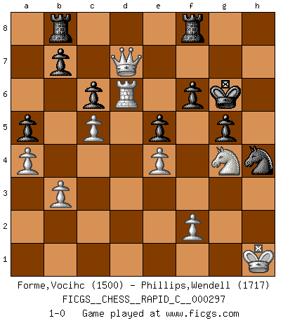 Last move : 1-0 2023 July 26 23:19:39 [Event "FICGS__CHESS__RAPID_C__000297"] [Site "FICGS"] [Date "2023.06.25"] [Round "1"] [White "Forme,Vocihc"] [Black "Phillips,Wendell"] [Result "1-0"] [WhiteElo "1500"] [BlackElo "1717"] 1.e4 d6 2.d4 c6 3.c4 Nd7 4.Nc3 e5 5.dxe5 dxe5 6.Nf3 Be7 7.Be2 h6 8.O-O Qc7 9.Qc2 Nf8 10.Be3 Ng6 11.h3 Nf6 12.Rfd1 Be6 13.c5 Qc8 14.a4 a5 15.b3 Nh7 16.Nb1 Ng5 17.Nbd2 Bxh3 18.gxh3 Qxh3 19.Nh2 Nh4 20.Bf1 Qe6 21.Kh1 Rd8 22.Nc4 Ra8 23.Nd6+ Bxd6 24.Rxd6 Qc8 25.Rad1 O-O 26.Bxg5 hxg5 27.Qd2 f6 28.Rd7 Ng6 29.Bc4+ Kh7 30.Be6 Nh4 31.Rxg7+ Kxg7 32.Bxc8 Raxc8 33.Qd7+ Kg6 34.Rd6 Rb8 35.Ng4 1-0 Follow this game move after move (download)Your body has to be in top condition. Your Chess deteriorates as your body does. You can't separate body from mind. (Bobby Fischer) Verschiedene, sehr schätzbare und im Laufe des Lebens nützliche Eigenschaften des Geistes können durch das Schachspiel erworben und gekräftigt werden, so dass sie zu Gewohnheiten werden, die uns nie im Stich lassen. (Benjamin Franklin) Algunos sacrificios son sólidos, los demás son míos. (Mikhail Tal) Même un GMI sait rarement calculer sur plus de cinq coups une attaque à sacrifices. (Rudolf Spielmann) Logic : The art of thinking and reasoning in strict accordance with the limitations and incapacities of the human misunderstanding. (Ambrose Bierce)