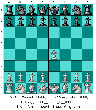Last move : 1-0 2023 August 5 6:9:11 [Event "FICGS__CHESS__CLASS_D__000296"] [Site "FICGS"] [Date "2023.06.25"] [Round "1"] [White "Pintor,Manuel"] [Black "Dittmer,Lutz"] [Result "1-0"] [WhiteElo "1786"] [BlackElo "1800"] 1.e4 1-0 This chess game has been lost on time (started : 2023.06.25 18:30:12) Follow this game move after move (download)All I want to do, ever, is just play Chess. (Bobby Fischer) Ein typischer, sehr verbreiteter Gedankenschädling ist der, daß der betreffende Amateur von der Annanhme ausgeht, daß jeder einzelne Zug etwas zu leisten habe. (Aaron Nimzowitsch) No hay precio que sea tan grande por la cabellera del Rey enemigo. (Koblentz) A chaque perte on perd un peu de soi. (Joël Lautier) Don't anthropomorphize computers - they hate it. (Anonymous)