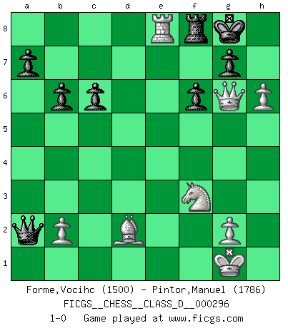 Last move : 1-0 2023 August 23 15:16:38 [Event "FICGS__CHESS__CLASS_D__000296"] [Site "FICGS"] [Date "2023.06.25"] [Round "1"] [White "Forme,Vocihc"] [Black "Pintor,Manuel"] [Result "1-0"] [WhiteElo "1500"] [BlackElo "1786"] 1.e4 e5 2.Nf3 Nc6 3.Bb5 Bc5 4.c3 Qf6 5.d4 exd4 6.e5 Nxe5 7.Qe2 c6 8.Nxe5 Ne7 9.Bd3 O-O 10.O-O dxc3 11.Nxc3 d6 12.Nf3 Ng6 13.Qc2 d5 14.Nxd5 Bxf2+ 15.Rxf2 Qd6 16.Ne3 Be6 17.Nf5 Bxf5 18.Bxf5 Rad8 19.Bg5 f6 20.Be3 b6 21.Rd2 Qe7 22.Re1 Rxd2 23.Bxd2 Qd6 24.Bxg6 hxg6 25.Qxg6 Qd7 26.h4 Qf7 27.h5 Qxa2 28.Re7 Rf7 29.Re8+ Rf8 30.h6 1-0 Follow this game move after move (download)Chess holds its master in its own bonds, shackling the mind and brain so that the inner freedom of the very strongest must suffer. (Albert Einstein) Ein Remis kann durch Wiederholung von drei Zügen oder durch einen schlechte Zug erreicht werden. (Savielly Grigorievitsch Tartakower) Bendita sea la memoria de aquel que dio al mundo este juego inmortal. (A. G. Gardiner) En blitz, le Cavalier l'emporte sur le Fou. (Vlastimil Hort) Think like a man of action, act like a man of thought. (Henri Louis Bergson)