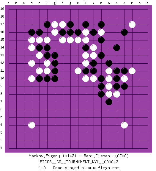 Last move : 1-0 2007 December 9 8:31:48 [Event "FICGS__GO__TOURNAMENT_KYU__000043"] [Site "FICGS"] [Date "2007.09.02"] [Round "1"] [Black "Yarkov,Evgeny"] [White "Beni,Clement"] [Result "1-0"] [Rating 1 "0142"] [Rating 2 "0700"] 1.q16 d4 2.d16 q4 3.p14 r11 4.q11 q10 5.p11 d10 6.e10 e11 7.f10 f11 8.g10 d14 9.e14 e15 10.f14 d15 11.e16 e13 12.f13 d12 13.g11 g16 14.f17 f15 15.g12 f12 16.g13 k15 17.h16 n16 18.n17 h15 19.j16 j15 20.k16 l16 21.l17 l10 22.l11 k11 23.m12 l12 24.m11 l13 25.l14 m14 26.m16 l15 27.n15 m10 28.n10 o10 29.p10 o9 30.n9 r17 31.p9 o8 32.n8 o11 33.o12 m13 34.n13 h17 35.j17 g17 36.o7 p8 37.q9 1-0 This go game has been lost on time (started : 2007.09.02 10:7:16) Here are the names of the openings (joseki) played in the four corners : Corner d16 : d16 e11 Hoshi (Hwajeom, Seongjeom, Xingwei`) 4-4 Point. The star or hoshi (4-4) point, emphasizing influence at the potential expense of territory. Player Black won this Go (weiqi, baduk) game. Follow this game move after move (download)Keshi is worth as much as an invasion ! (Anonymous) If only people were all showed a certain minimum level of niceness; if only people didn't retract verbal draw offers (without draw box ticked) on ficgs; if only people didn't kill; if only people didn't run concentration / extermination camps, if only people didn't drop nuclear bombs on Hiroshima and Nagasaki, and so on - it would be a much more beautiful world. But sadly, things are not so... (Normajean Yates)