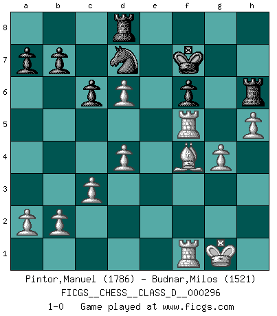 Last move : 1-0 2023 July 15 15:41:56 [Event "FICGS__CHESS__CLASS_D__000296"] [Site "FICGS"] [Date "2023.06.25"] [Round "1"] [White "Pintor,Manuel"] [Black "Budnar,Milos"] [Result "1-0"] [WhiteElo "1786"] [BlackElo "1521"] 1.e4 e5 2.f4 exf4 3.Nf3 h6 4.Bc4 Bc5 5.d4 Bd6 6.e5 Bb4+ 7.c3 Ba5 8.O-O c6 9.Bxf4 Ne7 10.h4 Nf5 11.Ng5 d5 12.exd6 hxg5 13.Bxg5 f6 14.Qe2+ Kf8 15.Be6 Bxe6 16.Qxe6 Qd7 17.Qxf5 Qxf5 18.Rxf5 Bd8 19.Nd2 Nd7 20.Ne4 Kf7 21.Raf1 Rh5 22.g4 Rh7 23.h5 Kg8 24.Bh4 g5 25.Bg3 Kg7 26.Nxg5 Rh6 27.Ne6+ Kf7 28.Nxd8+ Rxd8 29.Bf4 1-0 Follow this game move after move (download)When the Chess game is over, the Pawn and the King go back to the same box. (Irish saying) Ich bewundere Kasparows phantasievolle Angriffssiege aus den Achtzigern und Neunzigern, aber wenn man sie mit dem Computer überprüft, nimmt der Computer in jeder zweiten Partie die Opfer an, verteidigt sich und gewinnt. (Vladimir Kramnik) Un entendimiento a fondo de las continuaciones típicas del mate, hace de las combinaciones de sacrificio mas complicadas conducirlas a ellas no solo sin dificultad, sino casi de una manera natural. (Siegbert Tarrasch) Je ne suis pas le dernier à jouer lâchement des coups douteux pendant le zeïtnot de l'adversaire pour l'achever: en effet les coups qui font le plus peur sont ceux que l'on ne comprend pas. Je me fais souvent peur quand je joue. (Un professeur anonyme) Life is like a play: it's not the length but the excellence of the acting that matters. (Seneca)