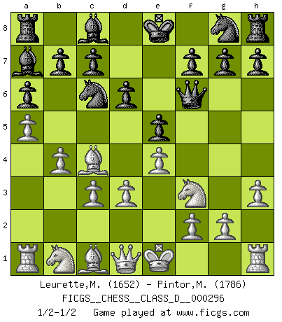 Last move : 1/2-1/2 2023 July 1 23:22:12 [Event "FICGS__CHESS__CLASS_D__000296"] [Site "FICGS"] [Date "2023.06.25"] [Round "1"] [White "Leurette,Marc-Antoine"] [Black "Pintor,Manuel"] [Result "1/2-1/2"] [WhiteElo "1652"] [BlackElo "1786"] 1.e4 e5 2.Nf3 Nc6 3.Bc4 Qf6 4.c3 Bc5 5.b4 Bb6 6.a4 a6 7.a5 Ba7 8.d3 d6 9.h3 Qg6 10.Nh4 Qf6 11.Nf3 Qg6 12.Nh4 Qf6 13.Nf3 1/2-1/2 Follow this game move after move (download)Chess is a beautiful mistress. (Bent Larsen) Ein Kibitz ist einer, der deinem Gegner gute Ratschläge gibt. (Andrew Soltis) No es una movida, aún la mejor movida que tu debas buscar, sino un plan comprensible. (Eugene Znosko-Borovsky) Mon pion favori sur ma case favorite ! Bronstein en parlant d'un coup de pion en h5 quand il avait les Noirs. A journey of a thousand sites begins with a single click. (Author unknown)