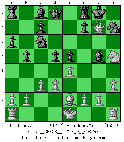 Last move : 1-0 2023 July 3 18:7:1 [Event "FICGS__CHESS__CLASS_D__000296"] [Site "FICGS"] [Date "2023.06.25"] [Round "1"] [White "Phillips,Wendell"] [Black "Budnar,Milos"] [Result "1-0"] [WhiteElo "1717"] [BlackElo "1521"] 1.e4 e5 2.d3 Nf6 3.Be2 h6 4.c3 Bd6 5.h3 O-O 6.Nd2 Nc6 7.Nf1 a6 8.Ng3 Be7 9.Nf3 d6 10.Bd2 b5 11.Qc1 d5 12.Bxh6 gxh6 13.Qxh6 Nh7 14.Nh5 Bf6 15.Ng5 Bxg5 16.Qg7+ 1-0 Follow this game move after move (download)In Chess, as it is played by masters, chance is practically eliminated. (Emanuel Lasker) Wenn Spassky eine Figur opfert kannst du genauso gut aufgeben. Aber wenn Tal eine Figur opfert, spiel weiter. Er könnte noch eine weitere opfern, und dann ... wer weiß? (Miguel Najdorf) Aquel que toma al Peón de Caballo de la Reina, se pasará la noche a dormir en la calle. (Anónimo) Toutes choses étant égales, c'est la conviction qui gagne. Alliée à une volonté de vaincre, elle sert de détonateur, suscite des idées, disperse les doutes et aide à penser clairement. (Robert Fischer) Real knowledge is to know the extent of one's ignorance. (Confucius)