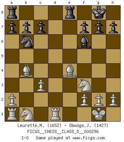 Last move : 1-0 2023 September 15 3:53:0 [Event "FICGS__CHESS__CLASS_D__000296"] [Site "FICGS"] [Date "2023.06.25"] [Round "1"] [White "Leurette,Marc-Antoine"] [Black "Obwoge,Joseph"] [Result "1-0"] [WhiteElo "1652"] [BlackElo "1427"] 1.e4 e5 2.Nf3 Nc6 3.Bc4 Bc5 4.c3 Nf6 5.b4 Be7 6.Ng5 O-O 7.d3 d5 8.exd5 Nxd5 9.Nf3 Bf6 10.O-O Bf5 11.Bb2 Nb6 12.Bb5 Bxd3 13.Bxd3 e4 14.Bxe4 Nxb4 15.Ba3 Qxd1 16.Rxd1 Rfe8 17.Bxb4 1-0 This chess game has been lost on time (started : 2023.06.25 18:30:12) Follow this game move after move (download)I guess a certain amount of temperament is expected of Chess geniuses. (Ron Gross) Schach verlangt totale Konzentration. (Robert James Fischer) ¿Se han dado cuenta de que Fischer casi nunca ha tenido piezas malas? El las intercambia y las piezas malas se quedan con sus oponenets. (Yuri Balashov) On croit qu'il y a plus de mauvais joueurs que de bons joueurs, c'est faux : Il y a autant de joueurs qui gagnent que de joueurs qui perdent. (Philippe Geluck) Pretend inferiority and encourage his arrogance. (Sun Tzu)