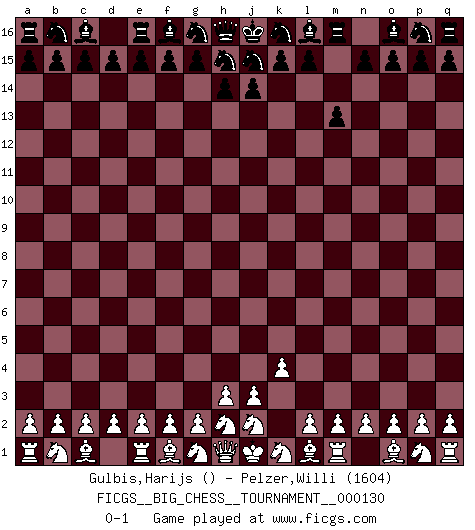 Last move : 0-1 2023 August 3 0:55:20 [Event "FICGS__BIG_CHESS__TOURNAMENT__000130"] [Site "FICGS"] [Date "2023.06.28"] [Round "1"] [White "Gulbis,Harijs"] [Black "Pelzer,Willi"] [Result "0-1"] [WhiteElo ""] [BlackElo "1604"] 1.k2-k4 m15-m13 0-1 This big chess game has been lost on time (started : 2023.06.28 17:10:8) Follow this game move after move (download)A Chess game is divided into three stages: the first, when you hope you have the advantage, the second when you believe you have an advantage, and the third... when you know you're going to lose ! (Savielly Tartakower) Mit Schach schule ich mein Gefühl für Geometrie, was für Tennis und Schach gleichermaßen wichtig ist. (Boris Becker) Los libros de Ajedrez deben de usarse igual como usamos los anteojos: para mejorar la vista, aunque algunos jugadores los quieren usar como si ellos les otorgaran la vision. (José Raúl Capablanca) Tous ces prétendus hommes politiques sont les pions, les Cavaliers, les Tours ou les Fous d'une partie d'échecs qui se jouera tant qu'un hasard ne renversera pas l'échiquier. (Honoré de Balzac) Hold em is to stud what chess is to checkers. (Johnny Moss)