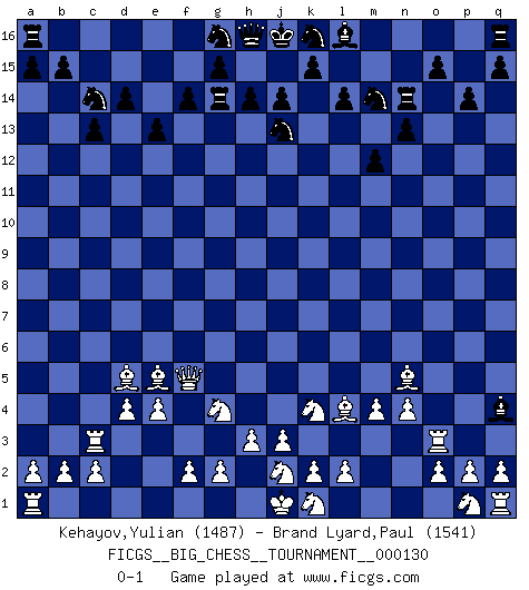 Last move : 0-1 2023 September 14 2:6:29 [Event "FICGS__BIG_CHESS__TOURNAMENT__000130"] [Site "FICGS"] [Date "2023.06.28"] [Round "1"] [White "Kehayov,Yulian"] [Black "Brand Lyard,Paul"] [Result "0-1"] [WhiteElo "1487"] [BlackElo "1541"] 1.j2-k4 p16-o14 2.h1-l4 l15-l14 3.b1-c3 m15-m14 4.h2-g4 j15-k13 5.e2-e4 e15-e13 6.d2-d4 e16-e14 7.c1-f4 e14-f14 8.f4-e5 n15-n13 9.f1-c4 m16-m15 10.l4-o4 d15-d14 11.m2-m4 m14-m13 12.n2-n4 o16-b4 13.e1-e3 b4-c3 14.e3-c3 c15-c13 15.o1-l4 m15-m14 16.o4-o7 f16-e15 17.l1-o4 c16-p4 18.m1-m3 f14-g14 19.o7-p7 p4-k9 20.c4-d5 m14-n14 21.m3-p3 p15-p14 22.g1-j2 o14-n12 23.p7-k7 b16-c14 24.k7-k9 e15-q4 25.p3-o3 m13-m12 26.k9-n12 k13-m14 27.n12-f5 f15-f14 28.o4-n5 h15-j13 0-1 This big chess game has been lost on time (started : 2023.06.28 17:10:8) Follow this game move after move (download)A passed Pawn increases in strength as the number of pieces on the board diminishes. (Capablanca) Das ganze Leben mit einer Ehefrau ist wie ein Endspiel mit ungleichfarbigen Läufern. (Viktor Kortschnoi) La belleza de un movimiento no se refleja solo en su apariencia, sino en el pensamiento detrás de él. (Siegbert Tarrasch) Une platitude souvent récitée à propos des Echecs est qu'une des choses les plus difficiles à réaliser est de gagner une position gagnante. Cela ne manque pas de sens mais, pour ma part, j'ai toujours trouvé plus difficile de gagner une position perdante. (Tim Krabbe) Luck is when opportunity knocks and you answer. (Anonymous)