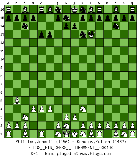 Last move : 0-1 2023 July 1 20:58:20 [Event "FICGS__BIG_CHESS__TOURNAMENT__000130"] [Site "FICGS"] [Date "2023.06.28"] [Round "1"] [White "Phillips,Wendell"] [Black "Kehayov,Yulian"] [Result "0-1"] [WhiteElo "1466"] [BlackElo "1487"] 1.j2-k4 p16-o14 2.b1-c3 j15-k13 3.e2-e4 b16-c14 4.f2-f4 f15-f13 5.d2-d4 e15-e13 6.f1-b5 h16-l13 0-1 Follow this game move after move (download)Mistrust is the most necessary characteristic of the Chess player. (Siegbert Tarrasch) Die Arbeit ist etwas Unnatürliches. Die Faulheit allein ist göttlich. (Anatole France) Los Peones son nacidos libres, y aún así, se encuentran por doquier encadenados. (Rick Kennedy) Dieu déplace le joueur, et celui-ci la pièce. Quel Dieu derrière Dieu commence donc la trame ? Arturo Perez-Reverte (prix de littérature policière 1993). Ah, beer! The cause of, and the solution to, all of life's problems. (Homer Simpson)
