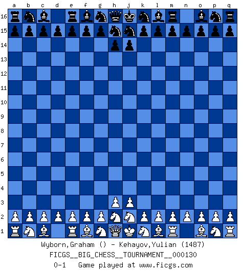 Last move : 0-1 2023 July 28 21:33:24 [Event "FICGS__BIG_CHESS__TOURNAMENT__000130"] [Site "FICGS"] [Date "2023.06.28"] [Round "1"] [White "Wyborn,Graham"] [Black "Kehayov,Yulian"] [Result "0-1"] [WhiteElo ""] [BlackElo "1487"] 0-1 This big chess game has been lost on time (started : 2023.06.28 17:10:8) Follow this game move after move (download)You know, comrade Pachman, I don't enjoy being a Minister, I would rather play Chess like you. (Che Guevara) Nach Morphy wurde nichts neues mehr in der Behandlung offener Positionen gefunden. (Mikhail Moiseyevich Botvinik) Cuando tu casa esta en llamas, no puedes ser molestado por tus vecinos. O, como decinos en Ajedrez, si tu Rey esta bajo ataque, no te preocupa perder un Peón del lado de la Reina. (Gary Kasparov) La solitude du joueur d'Echecs à l'approche du mat est semblable à celle du condamné. (Francis Szpiner) Whoever said the pen is mightier than the sword obviously never encountered automatic weapons. (US General Douglas MacArthur)