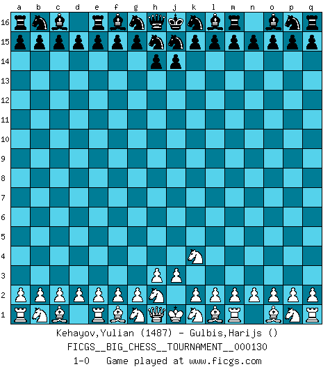 Last move : 1-0 2023 July 30 16:2:5 [Event "FICGS__BIG_CHESS__TOURNAMENT__000130"] [Site "FICGS"] [Date "2023.06.28"] [Round "1"] [White "Kehayov,Yulian"] [Black "Gulbis,Harijs"] [Result "1-0"] [WhiteElo "1487"] [BlackElo ""] 1.j2-k4 1-0 This big chess game has been lost on time (started : 2023.06.28 17:10:8) Follow this game move after move (download)If a ruler does not understand Chess, how can he rule over a kingdom ? (King Khusros II) Ein Remis kann durch Wiederholung von drei Zügen oder durch einen schlechte Zug erreicht werden. (Savielly Grigorievitsch Tartakower) Bendita sea la memoria de aquel que dio al mundo este juego inmortal. (A. G. Gardiner) D'abord les bases : Jouez et étudiez, puis étudiez et jouez, ensuite jouez et étudiez, puis étudiez et jouez. Deuxièmement : Donnez toujours le meilleur de vous-même ! (Ken Smith) Computer Science is no more about computers than astronomy is about telescopes. (Edsger W. Dijkstra)