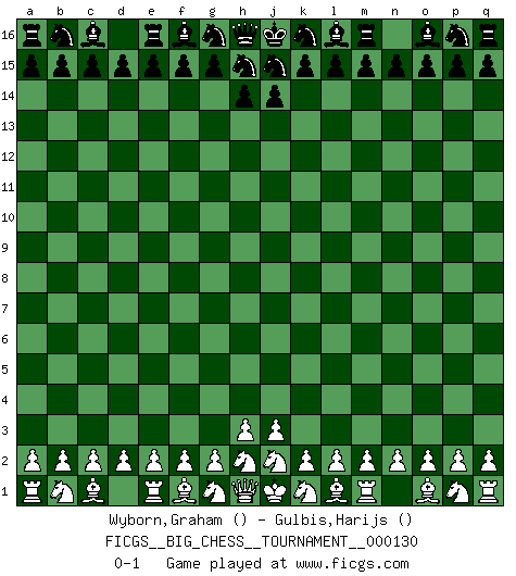 Last move : 0-1 2023 July 28 21:33:24 [Event "FICGS__BIG_CHESS__TOURNAMENT__000130"] [Site "FICGS"] [Date "2023.06.28"] [Round "1"] [White "Wyborn,Graham"] [Black "Gulbis,Harijs"] [Result "0-1"] [WhiteElo ""] [BlackElo ""] 0-1 This big chess game has been lost on time (started : 2023.06.28 17:10:8) Follow this game move after move (download)What would Chess be without silly mistakes ? (Kurt Richter) Ich würde die 30 stärksten Spieler der USA im Simultanspiel besiegen. (José Raúl Capablanca) Existen dos clases de sacrificios: los correctos y los míos. (Mikhail Tal) Il vaut mieux sacrifier les pièces de l'adversaire. (Xavier Tartacover) It's only after you lost everything, Tyler says, that you're free to do anything. (Chuck Palahniuk, Fight Club)
