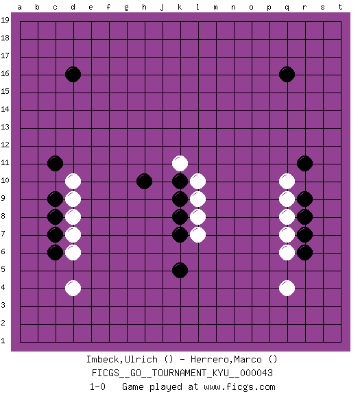 Last move : 1-0 2007 October 20 19:33:19 [Event "FICGS__GO__TOURNAMENT_KYU__000043"] [Site "FICGS"] [Date "2007.09.02"] [Round "1"] [Black "Imbeck,Ulrich"] [White "Herrero,Marco"] [Result "1-0"] 1.q16 d4 2.d16 q4 3.c6 d6 4.c7 d7 5.c9 d8 6.c8 d9 7.c11 d10 8.r6 q6 9.r7 q7 10.r9 q8 11.r8 q9 12.r11 q10 13.k10 k11 14.h10 l10 15.k9 l9 16.k7 l8 17.k8 l7 18.k5 1-0 This go game has been lost on time (started : 2007.09.02 10:7:16) Here are the names of the openings (joseki) played in the four corners : Corner d4 : d4 c6 Hoshi (Hwajeom, Seongjeom, Xingwei`) 4-4 Point. The star or hoshi (4-4) point, emphasizing influence at the potential expense of territory. Ikken Kakari (Hankan Keolch'im, Yi Gua`jiao~, 1-Space Low Approach). Black 2 is the standard approach move to the 4-4. Corner q4 : q4 r6 Hoshi (Hwajeom, Seongjeom, Xingwei`) 4-4 Point. The star or hoshi (4-4) point, emphasizing influence at the potential expense of territory. Ikken Kakari (Hankan Keolch'im, Yi Gua`jiao~, 1-Space Low Approach). Black 2 is the standard approach move to the 4-4. Player Black won this Go (weiqi, baduk) game. Follow this game move after move (download)Strike at the waist of the knight's move. (Anonymous) The worth of a book is to be measured by what you can carry away from it. (James Bryce)