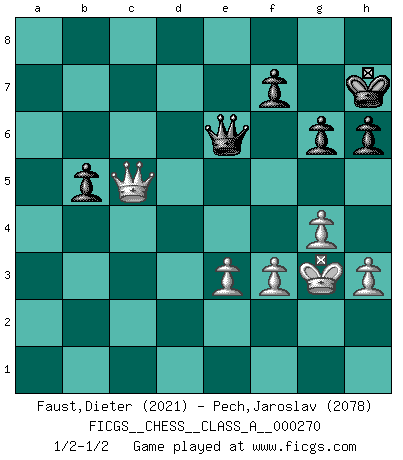 Last move : 1/2-1/2 2024 March 28 19:3:24 [Event "FICGS__CHESS__CLASS_A__000270"] [Site "FICGS"] [Date "2023.07.02"] [Round "1"] [White "Faust,Dieter"] [Black "Pech,Jaroslav"] [Result "1/2-1/2"] [WhiteElo "2021"] [BlackElo "2078"] 1.d4 d5 2.c4 e6 3.Nc3 Nf6 4.Bg5 Be7 5.cxd5 Nxd5 6.Bxe7 Qxe7 7.Rc1 O-O 8.Nf3 Nxc3 9.Rxc3 Nc6 10.e3 e5 11.Nxe5 Nxe5 12.dxe5 Qxe5 13.Bc4 c6 14.O-O g6 15.Qb3 Qe7 16.Rd1 Bf5 17.a4 Rad8 18.R3c1 b6 19.Qc3 Rxd1+ 20.Rxd1 Rd8 21.Rxd8+ Qxd8 22.h3 Qd1+ 23.Kh2 Qxa4 24.g4 Be4 25.b3 Qa5 26.Qf6 Bd5 27.Qd6 Bxc4 28.bxc4 Qg5 29.Qb8+ Kg7 30.Qxa7 b5 31.cxb5 cxb5 32.Qa3 h6 33.f3 Qd5 34.Qc3+ Kg8 35.Kg2 Qd6 36.Qc8+ Kh7 37.Qb7 Qd2+ 38.Kg3 Qe1+ 39.Kf4 Qb4+ 40.Qe4 Qd6+ 41.Qe5 Qb4+ 42.Kg3 Qc4 43.Qf4 Qb3 44.Qd4 Qe6 45.Qc5 1/2-1/2 Follow this game move after move (download)Don't even mention losing to me. I can't stand to think of it. (Bobby Fischer) Wenn ich mich einlogge, glauben die Leute gewöhnlich nicht, dass ich es selbst bin und sie fangen an, mir dumme Fragen zu stellen. Und wenn sie es glauben, stellen sie wieder andere dumme Fragen. (Judith Polgar) El Ajedrez es imaginación. (David Bronstein) La tactique est l'élément le plus important du milieu de jeu. (Siegbert Tarrasch) The intuitive mind is a sacred gift; the rational mind is a faithful servant. We have created a society that honors the servant but has forgotten the gift. (Albert Einstein)