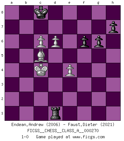 Last move : 1-0 2023 October 22 10:21:11 [Event "FICGS__CHESS__CLASS_A__000270"] [Site "FICGS"] [Date "2023.07.02"] [Round "1"] [White "Endean,Andrew"] [Black "Faust,Dieter"] [Result "1-0"] [WhiteElo "2006"] [BlackElo "2021"] 1.d4 Nf6 2.c4 e6 3.Nf3 d5 4.Nc3 Bb4 5.Bg5 Nbd7 6.cxd5 exd5 7.e3 c5 8.Bd3 c4 9.Bf5 Qa5 10.Qc2 O-O 11.O-O Re8 12.Nd2 g6 13.Bxd7 Nxd7 14.e4 Bxc3 15.Qxc3 Qxc3 16.bxc3 Nb6 17.f3 Bd7 18.Rab1 Re6 19.Bh6 Rb8 20.a4 dxe4 21.fxe4 Bxa4 22.Rb4 a5 23.Rb2 Bb3 24.Nxb3 cxb3 25.Rxb3 Nd7 26.Bf4 a4 27.Rb4 Ra8 28.Rxb7 a3 29.Rxd7 a2 30.Kf2 Rb6 31.Ra1 Rb1 32.Rd8+ Rxd8 33.Rxa2 Rc8 34.Bd2 f6 35.Ra6 Re8 36.Ke3 Kf7 37.Ra7+ Re7 38.Rxe7+ Kxe7 39.d5 Rh1 40.h3 Rg1 41.c4 Rxg2 42.c5 Rh2 43.c6 Kd6 44.Bb4+ Kc7 45.Ba5+ Kd6 46.Kd4 Rxh3 47.Bb4+ Kc7 48.Kc5 Rd3 49.d6+ Kc8 50.Kc4 Rd1 51.Bc5 1-0 Follow this game move after move (download)The tactician knows what to do when there is something to do; whereas the strategian knows what to do when there is nothing to do. (Gerald Abrahams) Das Schachspiel übertrifft alle anderen Spiele so weit wie der Chimborasso einen Misthaufen. (Arthur Schopenhauer) En el Ajedrez, tal como es jugado por los Maestros, practicamente la suerte es eliminada. (Emanuel Lasker) Celui qui prend des risques peut perdre, celui qui n'en prend pas perd toujours. (Xavier Tartacover) Somewhere in the world there is an epigram for every dilemma. (Hendrik Willem van Loon)