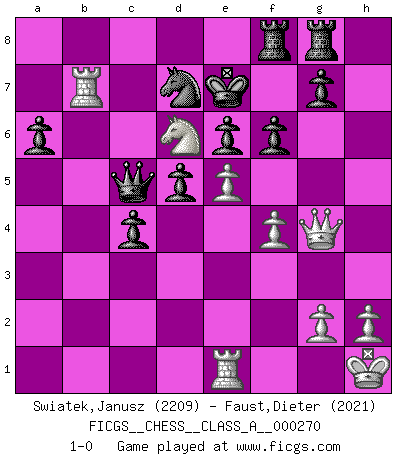 Last move : 1-0 2023 September 25 9:51:3 [Event "FICGS__CHESS__CLASS_A__000270"] [Site "FICGS"] [Date "2023.07.02"] [Round "1"] [White "Swiatek,Janusz"] [Black "Faust,Dieter"] [Result "1-0"] [WhiteElo "2209"] [BlackElo "2021"] 1.e4 e6 2.d4 d5 3.Nc3 Nf6 4.e5 Nfd7 5.f4 c5 6.Nf3 Nc6 7.Be3 cxd4 8.Nxd4 Bc5 9.Qd2 Bxd4 10.Bxd4 Nxd4 11.Qxd4 Qb6 12.Qd2 Qxb2 13.Rb1 Qa3 14.Nb5 Qxa2 15.Nd6+ Ke7 16.Rc1 b6 17.Be2 Qa5 18.c3 Ba6 19.O-O Bxe2 20.Qxe2 Qc5+ 21.Kh1 f6 22.Qg4 Rhg8 23.Qh4 b5 24.Rb1 a6 25.Rfe1 h5 26.c4 bxc4 27.Rb7 Rab8 28.Qxh5 Rbf8 29.Qg4 1-0 Follow this game move after move (download)A sacrifice is best refuted by accepting it. (Wilhelm Steinitz) Modernes Schach sorgt sich zuviel um Dinge wie Bauernstruktur usw. Vergessen Sie das, Schachmatt beendet das Spiel! (Nigel Short) El Ajedrez es el arte del análisis. (Mikhail Botvinnik) Le temps de noter son nom sur la feuille de partie, j'étais déjà en zeitnot ! D'un modeste amateur apparié lors de la première ronde d'un open contre le grand-maître Azmaïparashvili. If you have any trouble condescending, find a Unix user to show you how it's done. (Scott Adams)