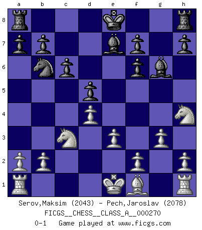 Last move : 0-1 2023 November 11 0:23:32 [Event "FICGS__CHESS__CLASS_A__000270"] [Site "FICGS"] [Date "2023.07.02"] [Round "1"] [White "Serov,Maksim"] [Black "Pech,Jaroslav"] [Result "0-1"] [WhiteElo "2043"] [BlackElo "2078"] 1.d4 d5 2.c4 e6 3.Nc3 Nf6 4.cxd5 exd5 5.Bg5 c6 6.e3 Bf5 7.Qf3 Bg6 8.Bxf6 Qxf6 9.Qxf6 gxf6 10.Nf3 Nd7 11.Nh4 Be7 12.g3 Nb6 0-1 Follow this game move after move (download)On the chessboard, lies and hypocrisy do not survive long. (Emanuel Lasker) Spielt Blackmar-Diemer-Gambit, und das Matt kommt von selbst! (Emil Joseph Diemer) No solamente yo pronostico su triunfo sobre Botvinnik, sino que me adelanto y digo que probablemente Fischer es el jugador de Ajedrez mas grande que haya existido. (John Collins) À la honte des hommes, on sait que les lois du jeu sont les seules qui soient partout justes, claires, inviolables et exécutées. Pourquoi l'Indien qui a donné les règles du jeu d'échecs est-il obéi de bon gré dans toute la terre, et que les décrétales des papes, par exemple, sont aujourd'hui un objet d'horreur et de mépris ? C'est que l'inventeur des échecs combina tout avec justesse pour la satisfaction des joueurs, et que les papes, dans leurs décrétales, n'eurent en vue que leur seul avantage. L'Indien voulut exercer également l'esprit des hommes et leur donner du plaisir; les papes ont voulu abrutir l'esprit des hommes. Voltaire (Dictionnaire philosophique / Garnier 1967) The man who strikes first admits that his ideas have given out. (Chinese proverb)