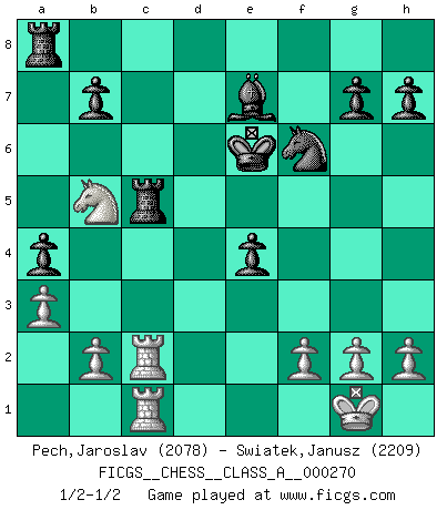 Last move : 1/2-1/2 2023 November 16 0:5:36 [Event "FICGS__CHESS__CLASS_A__000270"] [Site "FICGS"] [Date "2023.07.02"] [Round "1"] [White "Pech,Jaroslav"] [Black "Swiatek,Janusz"] [Result "1/2-1/2"] [WhiteElo "2078"] [BlackElo "2209"] 1.d4 Nf6 2.c4 e6 3.Nc3 d5 4.Nf3 c5 5.cxd5 cxd4 6.Qxd4 exd5 7.e4 dxe4 8.Qxd8+ Kxd8 9.Ng5 Be6 10.Nxe6+ fxe6 11.Bc4 Ke7 12.O-O Kf7 13.Nb5 Na6 14.a3 Be7 15.Be3 Rhc8 16.Rac1 Nc5 17.Rc2 a5 18.Rfc1 a4 19.Bxc5 Rxc5 20.Bxe6+ Kxe6 1/2-1/2 Follow this game move after move (download)During a Chess competition a Chessmaster should be a combination of a beast of prey and a monk. (Alexander Alekhine) Ich hatte meine größten Erfolge, als ich 47 Jahre alt war. Kasparow war noch nicht mal 42 und hat das Schach schon im Stich gelassen. (Viktor Kortschnoi) Los tropiezos estan todos ahí en el tablero, esperando que se cometan. (Savielly Tartakover) Les Echecs, c'est l'art de la guerre sans les charniers, c'est la résurrection des morts tombés au champ d'honneur, l'espoir perpétuel, la suprématie de l'intelligence sur la force, la culture de l'esprit. (F. Szpiner) Perception is reality. (Immanuel Kant)