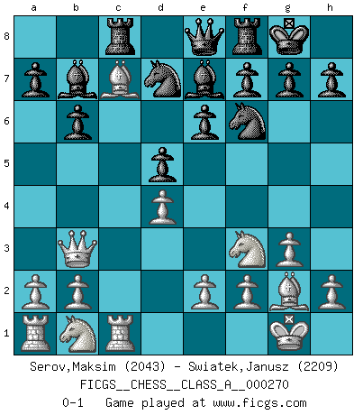 Last move : 0-1 2023 October 23 10:27:2 [Event "FICGS__CHESS__CLASS_A__000270"] [Site "FICGS"] [Date "2023.07.02"] [Round "1"] [White "Serov,Maksim"] [Black "Swiatek,Janusz"] [Result "0-1"] [WhiteElo "2043"] [BlackElo "2209"] 1.d4 Nf6 2.c4 e6 3.Nf3 d5 4.g3 Bb4+ 5.Bd2 Be7 6.Bg2 Nbd7 7.O-O O-O 8.Qc2 c6 9.Bf4 b6 10.cxd5 cxd5 11.Rc1 Bb7 12.Bc7 Qe8 13.Qb3 Rc8 0-1 This chess game has been lost on time (started : 2023.07.02 20:2:31) Follow this game move after move (download)Chess teaches you to control the initial excitement you feel when you see something that looks good and it trains you to think objectively when you're in trouble. (Stanley Kubrick) Ohne ihre Erfolge schmälern zu wollen würde ich sagen Petrosian, Spassky und Karpov verdanken ihre Siege ihren Trainern - Boleslavsky, Bondarevsky und Furman. (Mikhail Moiseyevich Botvinik) Cuando me preguntan: -¿Cual es el secreto que te hace hacer mejores movidas que tus oponentes?, Yo respondo: Me da gusto que me pregunten eso, porque, como veran, hay una simple razón. Yo pienso mis propias movidas y dejo a mi oponente que el piense las suyas. (Alexander Alekhine) L'action d'une oeuvre littéraire se déroule sur un champ de bataille. Les masques et les types du drame moderne correspondent aux pièces du jeu d'échecs. L'intrigue correspond aux coups et aux gambits, c'est à dire aux techniques du jeu telles qu'utilisées et interprétées par les joueurs. Les tactiques et les péripéties [mouvements] correspondent aux coups exécutés par l'adversaire. (Viktor Shklovsky) There is a computer disease that anybody who works with computers knows about. It's a very serious disease and it interferes completely with the work. The trouble with computers is that you 'play' with them ! (Richard P. Feynman)