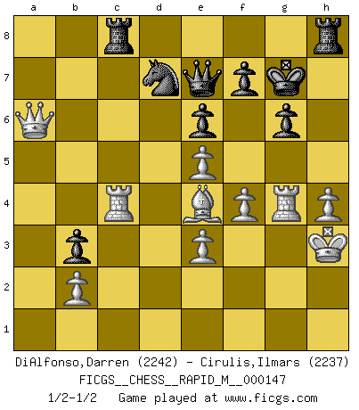 Last move : 1/2-1/2 2023 July 23 2:48:19 [Event "FICGS__CHESS__RAPID_M__000147"] [Site "FICGS"] [Date "2023.07.03"] [Round "1"] [White "DiAlfonso,Darren"] [Black "Cirulis,Ilmars"] [Result "1/2-1/2"] [WhiteElo "2242"] [BlackElo "2237"] 1.d4 d5 2.c4 c6 3.Nf3 Nf6 4.Nc3 e6 5.Bg5 Be7 6.e3 O-O 7.Rc1 Nbd7 8.Bd3 dxc4 9.Bxc4 h6 10.Bh4 b5 11.Bd3 Bb7 12.O-O Rc8 13.a3 a5 14.Ne5 Nxe5 15.dxe5 Nd7 16.Bxe7 Qxe7 17.f4 Nc5 18.Bb1 b4 19.axb4 axb4 20.Ne2 Ba6 21.Rf2 Bxe2 22.Qxe2 Rfd8 23.h3 Nd7 24.Be4 Nc5 25.Bb1 Nd7 26.g3 g6 27.h4 h5 28.Rg2 Kf8 29.Kh2 c5 30.Kh3 Kg7 31.Be4 b3 32.g4 hxg4+ 33.Rxg4 Rh8 34.Qa6 c4 35.Rxc4 1/2-1/2 Follow this game move after move (download)A man that will take back a move at Chess will pick a pocket. (Richard Fenton) Schach ist ein Reich, wo sich die menschliche Phantasie frei entfalten kann. (David Bronstein) Fischer es una tragedia del Ajedrez Americano a la par con Morphy y Pillsbury. (Mig Greengard) Même si vous avez un bon coup à faire, regardez toujours s'il n'y en a pas un qui lui soit préférable. (Pedro Damiano) All the biggest technological inventions created by man - the airplane, the automobile, the computer - says little about his intelligence, but speaks volumes about his laziness. (Mark Kennedy)