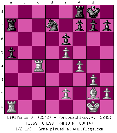 Last move : 1/2-1/2 2023 August 30 7:34:59 [Event "FICGS__CHESS__RAPID_M__000147"] [Site "FICGS"] [Date "2023.07.03"] [Round "1"] [White "DiAlfonso,Darren"] [Black "Perevozchikov,Vjacheslav"] [Result "1/2-1/2"] [WhiteElo "2242"] [BlackElo "2245"] 1.d4 e6 2.c4 Nf6 3.g3 d5 4.Bg2 dxc4 5.Nf3 Bb4+ 6.Bd2 a5 7.Qc2 Bxd2+ 8.Qxd2 c6 9.a4 b5 10.axb5 cxb5 11.Qg5 O-O 12.Qxb5 Ba6 13.Qa4 Qb6 14.O-O Qxb2 15.Nbd2 Bb5 16.Nxc4 Bxa4 17.Nxb2 Bb5 18.Ne5 Ra7 19.Nbc4 Nbd7 20.Rfc1 Nxe5 21.dxe5 Bxc4 22.Rxc4 Nd7 23.f4 1/2-1/2 Follow this game move after move (download)Some sacrifices are sound; the rest are mine. (Mikhail Tal) Je älter ich werde, um so mehr schätze ich die Bauern. (Paul Keres) Un buen jugador siempre tiene buena suerte. (José Raúl Capablanca) Les ravages du H expliquent la différence de niveau entre Tal et Thal [Abergel]. I take risks, sometimes patients die, but not taking risks causes more patients to die. So I guess my biggest problem is I've been cursed with the ability to do the math. (Gregory House, House M.D.)