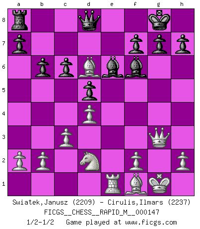 Last move : 1/2-1/2 2023 August 21 21:51:20 [Event "FICGS__CHESS__RAPID_M__000147"] [Site "FICGS"] [Date "2023.07.03"] [Round "1"] [White "Swiatek,Janusz"] [Black "Cirulis,Ilmars"] [Result "1/2-1/2"] [WhiteElo "2209"] [BlackElo "2237"] 1.e4 e5 2.Nf3 Nc6 3.Bb5 Nf6 4.O-O Nxe4 5.Re1 Nd6 6.Nxe5 Be7 7.Bf1 Nxe5 8.Rxe5 O-O 9.d4 Bf6 10.Re1 Re8 11.Bf4 Rxe1 12.Qxe1 Ne8 13.c3 d5 14.Nd2 Bf5 15.Qe3 c6 16.Re1 Nd6 17.Nb3 b6 18.g4 Be6 19.Nd2 Bxg4 20.Qg3 Be6 21.Bxd6 1/2-1/2 Follow this game move after move (download)Fischer is the strongest player in the world. In fact, the strongest player who ever lived. (Larry Evans) Schach ist Leben. (Robert James Fischer) Bobby solo arroja las piezas y solas caen en las casillas correctas. (Miguel Najdorf ) Vouloir jouer aux échecs contre soi-même est aussi paradoxal que vouloir marcher sur son ombre. (Stefan Zweig) Depression is just anger without enthusiasm. (Unknown)