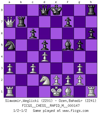 Last move : 1/2-1/2 2023 July 21 16:14:51 [Event "FICGS__CHESS__RAPID_M__000147"] [Site "FICGS"] [Date "2023.07.03"] [Round "1"] [White "Slawomir,Weglicki"] [Black "Ozen,Bahadir"] [Result "1/2-1/2"] [WhiteElo "2201"] [BlackElo "2241"] 1.d4 Nf6 2.c4 e6 3.Nf3 d5 4.Nc3 Bb4 5.Qa4+ Nc6 6.a3 Bxc3+ 7.bxc3 Bd7 8.cxd5 exd5 9.Bg5 h6 10.Bh4 g5 11.Bg3 Ne4 12.Qb3 Bf5 13.Qxb7 Na5 14.Qb4 c6 15.Nd2 Nxg3 16.hxg3 Rb8 17.Qc5 Rb5 18.Qxa7 Rb7 19.Qc5 Rb5 20.Qa7 Rb7 1/2-1/2 Follow this game move after move (download)Chess opens and enriches your mind. (Saudin Robovic) Wenn es im Universum noch irgendwo intelligente Lebewesen gibt, dann kennen sie Go. (Emanuel Lasker) El muchacho (en ese entonces un niño de 12 años llamado Anatoly Karpov) no tiene ni idea de lo que es el Ajedrez y no hay futuro en absoluto para el en esta profesión. (Mikhail Botvinnik) Mais l'homme est une créature légère et illogique : semblable au joueur d'échecs, il n'aime que le processus du but à atteindre, non le but lui-même. (Dostoïevsky) There are more things in heaven and earth than practically anywhere else. (Unknown)