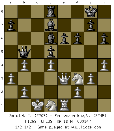 Last move : 1/2-1/2 2023 October 29 22:2:18 [Event "FICGS__CHESS__RAPID_M__000147"] [Site "FICGS"] [Date "2023.07.03"] [Round "1"] [White "Swiatek,Janusz"] [Black "Perevozchikov,Vjacheslav"] [Result "1/2-1/2"] [WhiteElo "2209"] [BlackElo "2245"] 1.e4 e6 2.d4 d5 3.Nc3 Nf6 4.Bg5 h6 5.Bxf6 Qxf6 6.a3 c6 7.h4 Nd7 8.Nf3 Qd8 9.Bd3 Be7 10.Qd2 Qc7 11.O-O-O Rb8 12.exd5 cxd5 13.Rde1 b5 14.Bxb5 O-O 15.Bxd7 Qxd7 16.Re3 f6 17.Rhe1 Qc6 18.Nd1 Bd6 19.Rc3 Qa4 20.g3 Bd7 21.Qd3 Bb5 22.Qe3 Bd7 23.Qd3 Bb5 24.Qd2 Bd7 25.Qe2 Rfd8 26.Qd3 Bb5 27.Qd2 Bd7 28.Qd3 Bb5 29.Qd2 Bd7 30.Qe2 Rb6 31.Qd3 Bb5 32.Qe3 Bd7 33.Rb3 Rxb3 34.cxb3 Qb5 35.b4 1/2-1/2 Follow this game move after move (download)Fischer sacrificed virtually everything most of us weakies (to use his term) value, respect, and cherish, for the sake of an artful, often beautiful board game, for the ambivalent privilege of being its greatest master. (Paul Kollar) Mit sehr nachdenklichem Gesicht schreitet Bobby durch den Turniersaal. Was ist passiert?, fragt Lombardy. Ich stehe schlecht, antwortet Fischer. Lombardy: Dann biete doch einfach Remis an. Fischer: So schlecht stehe ich nun auch wieder nicht! (Robert James Fischer) Tu sabes, camarada Pachman, no disfruto el ser un Ministro, preferería jugar al Ajedrez como tu. (Che Guevara) Avec des compensations pour le matériel en plus... (Anonyme) Faith : not wanting to know what is true. (Friedrich Nietzsche)