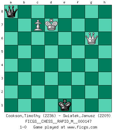 Last move : 1-0 2024 February 17 7:7:5 [Event "FICGS__CHESS__RAPID_M__000147"] [Site "FICGS"] [Date "2023.07.03"] [Round "1"] [White "Cookson,Timothy"] [Black "Swiatek,Janusz"] [Result "1-0"] [WhiteElo "2236"] [BlackElo "2209"] 1.e4 c5 2.Nf3 Nc6 3.d4 cxd4 4.Nxd4 Nf6 5.Nc3 d6 6.Bg5 e6 7.Qd2 Nxd4 8.Qxd4 Be7 9.O-O-O O-O 10.h4 Bd7 11.f3 Qb8 12.Qd2 Rd8 13.Bd3 b5 14.Ne2 a5 15.h5 h6 16.Bh4 a4 17.g4 a3 18.b3 d5 19.g5 Nxh5 20.gxh6 Bxh4 21.Rxh4 Qe5 22.c3 g6 23.exd5 exd5 24.Rg1 Kh8 25.Qg5 Qxg5+ 26.Rxg5 Nf6 27.Rf4 Ra6 28.Re5 Kh7 29.Re7 Be8 30.Rh4 d4 31.Rxd4 Rad6 32.Rxd6 Rxd6 33.Kd2 Kxh6 34.b4 Rd8 35.Ra7 Nd7 36.Nd4 Ne5 37.Rxa3 Bc6 38.f4 Nxd3 39.Kxd3 Kh5 40.Ra6 Be8 41.Rb6 Kg4 42.Ke3 Bd7 43.Nxb5 Re8+ 44.Kd4 Bxb5 45.Rxb5 Kxf4 46.Rb7 Rd8+ 47.Kc5 Rc8+ 48.Kd6 Rf8 49.b5 g5 50.Re7 g4 51.b6 g3 52.a4 g2 53.Re1 Kg3 54.a5 f5 55.b7 f4 56.a6 f3 57.a7 f2 58.Re3+ Kf4 59.a8Q Kxe3 60.Qxf8 g1Q 61.b8Q Qg3+ 62.Kc5 Qxb8 63.Qxb8 f1Q 64.Qd6 Qf5+ 65.Qd5 Qf8+ 66.Kb5 Qb8+ 67.Kc4 Qb2 68.Qe6+ Kf3 69.Kd3 Qa3 70.Qe4+ Kg3 71.Qb4 Qa1 72.c4 Qf1+ 73.Kc2 Qe2+ 74.Kb3 Qd1+ 75.Kb2 Kg4 76.Qe7 Qa4 77.Qe4+ Kg3 78.Qe5+ Kg4 79.c5 Qc4 80.Ka3 Kh3 81.Qd6 Kg2 82.c6 Qc3+ 83.Ka4 Qc4+ 84.Ka5 Qa2+ 85.Kb6 Qb2+ 86.Kc7 Qg7+ 87.Kc8 Qg8+ 88.Qd8 Qe6+ 89.Kb7 Qf7+ 90.Qc7 Qf3 91.Qg7+ Kh1 92.Qh8+ Kg2 93.Qb2+ Kh1 94.Qc2 Qd5 95.Qh7+ Kg2 96.Qg6+ Kf1 97.Kc8 Ke1 98.c7 Qa8+ 99.Kd7 1-0 Follow this game move after move (download)When asked, -How is that you pick better moves than your opponents?, I responded: I'm very glad you asked me that, because, as it happens, there is a very simple answer. I think up my own moves, and I make my opponent think up his. (Alexander Alekhine) Der Umstand, daß uns eine 7 Stunden Zeitkontrolle ermöglicht eine großartige, tiefe Partie zu spielen, ist für die Massenmedien nicht weiter von Bedeutung. (Alexej Shirov) Hay jugadores fuertes y personas amables y yo soy un jugador fuerte. (Bobby Fischer) Le joueur d'Echecs qui veut atteindre le top est obligé de développer son propre credo créatif. Alexeï Stepanovicth Souétine. Il est facile d'écrire des livres ! Ce qui est difficile, c'est de jouer ! (Alexeï Stepanovicth Souétine) I live to kill Traxler counterattack. (Ilmars Cirulis)