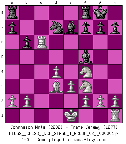Last move : 1-0 2006 July 10 12:32:33 [Event "FICGS__CHESS__WCH_STAGE_1_GROUP_02__000001 "] [Site "FICGS"] [Date "2006.07.01"] [Round "1"] [White "Johansson,Mats"] [Black "Frame,Jeremy"] [Result "1-0"] [WhiteElo "2282"] [BlackElo "1277"] 1.d4 d5 2.c4 e6 3.Nc3 Nf6 4.cxd5 exd5 5.Bg5 Be7 6.e3 Bf5 7.Bxf6 Bxf6 8.Qb3 b6 9.Qxd5 Qxd5 10.Nxd5 Bd8 11.Nf3 c6 12.Nf4 Nd7 13.Rc1 O-O 14.Rxc6 Be7 15.Bd3 1-0 QGD : Exchange, positional line Kingside Castling by player Black (move 13) Player White won this chess game. Follow this game move after move (download)Fischer is the strongest player in the world. In fact, the strongest player who ever lived. (Larry Evans) Wie bekannt hörte Morphy 1859 auf, Schach zu spielen. Seine Enttäuschung galt nicht so sehr dem Schach, wie den Schachspielern. (Robert James Fischer) La pasion por jugar al Ajedrez es una de las mas inexplicables en el mundo. (H.G. Wells) Je fais ceci parce que dans cinquante coups j'obtiendrai cela; je m'appelle Mikhail Moisevitch Botvinnik. (Botvinnik) Experiences are the keys to life. (Daniel Parmet)
