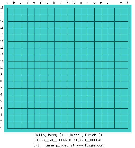 Last move : 0-1 2007 September 3 6:18:30 [Event "FICGS__GO__TOURNAMENT_KYU__000043"] [Site "FICGS"] [Date "2007.09.02"] [Round "1"] [Black "Smith,Harry"] [White "Imbeck,Ulrich"] [Result "0-1"] 0-1 Here are the names of the openings (joseki) played in the four corners : Player White won this Go (weiqi, baduk) game. Follow this game move after move (download)Balance is not what players strike for, and if it does arise, it is in spite of them. (Pierre Audouard) I have opinions of my own - strong opinions - but I don't always agree with them. (George Bush)