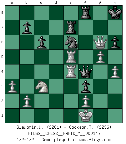 Last move : 1/2-1/2 2023 September 17 19:35:51 [Event "FICGS__CHESS__RAPID_M__000147"] [Site "FICGS"] [Date "2023.07.03"] [Round "1"] [White "Slawomir,Weglicki"] [Black "Cookson,Timothy"] [Result "1/2-1/2"] [WhiteElo "2201"] [BlackElo "2236"] 1.Nf3 d5 2.d4 Nf6 3.c4 e6 4.Nc3 c6 5.Bg5 h6 6.Bxf6 Qxf6 7.e3 Nd7 8.Bd3 dxc4 9.Bxc4 g6 10.O-O Bg7 11.Ne4 Qe7 12.Qc2 O-O 13.Bb3 a5 14.Rac1 e5 15.Ng3 exd4 16.exd4 Qd6 17.Rfe1 Nb6 18.a3 Nd5 19.Ne4 Qf4 20.Ne5 Bxe5 21.dxe5 Qxe5 22.Qd2 Qg7 23.h4 Rd8 24.Rc5 Be6 25.Rxa5 Rab8 26.Qc1 Re8 27.g3 Nc7 28.Bxe6 Rxe6 29.Nc3 Rbe8 30.Rf1 R6e7 31.Rd1 f5 32.Kf1 Rf8 33.Re1 f4 34.g4 Ne6 35.Rae5 Qf6 36.Qb1 f3 37.g5 Qf4 38.Qxg6+ Kh8 39.R1e4 Qc1+ 40.Re1 Qf4 41.R1e4 1/2-1/2 Follow this game move after move (download)Bobby is the finest Chess player this country ever produced. His memory for the moves, his brilliance in dreaming up combinations, and his fierce determination to win are uncanny. (John Collins) Schon mancher Spieler hat aufgegeben, um zu vermeiden, daß er eine Figur verliert. (Savielly Grigorievitsch Tartakower) El Ajedrez es como la guerra en un tablero. (Bobby Fischer) Plusieurs personnes se sont demandées comment Tal faisait pour gagner... En fait, c'est très simple ! Il met ses pièces au centre de l'échiquier et les sacrifie quelque part ! (David Bronstein) When you don't know what to do, walk fast and look worried. (Anonymous)