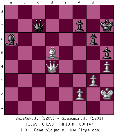 Last move : 1-0 2023 December 2 16:1:19 [Event "FICGS__CHESS__RAPID_M__000147"] [Site "FICGS"] [Date "2023.07.03"] [Round "1"] [White "Swiatek,Janusz"] [Black "Slawomir,Weglicki"] [Result "1-0"] [WhiteElo "2209"] [BlackElo "2201"] 1.e4 e5 2.Nf3 Nc6 3.Bb5 Nf6 4.O-O Nxe4 5.Re1 Nd6 6.Nxe5 Nxe5 7.Rxe5+ Be7 8.Bf1 O-O 9.d4 Bf6 10.Re1 Re8 11.Bf4 Rxe1 12.Qxe1 Ne8 13.c3 d5 14.Nd2 Nd6 15.h3 Bf5 16.Nb3 h6 17.Nc5 b6 18.Nd3 Bg5 19.Bh2 Nc4 20.Ne5 Nxb2 21.Qe2 Nc4 22.Nxc4 dxc4 23.Qf3 Be6 24.Bxc7 Qd5 25.Qg3 b5 26.Re1 Re8 27.Be5 g6 28.h4 Bd8 29.Qf4 Kh7 30.Bf6 Bxf6 31.Qxf6 h5 32.Qe5 Rd8 33.a3 Qd7 34.Be2 a5 35.Bf3 Bf5 36.Re3 b4 37.axb4 axb4 38.Qf6 bxc3 39.Re7 Qxe7 40.Qxe7 Rd7 41.Qc5 c2 42.Qxc4 Bd3 43.Qc5 Rxd4 44.Qxd4 c1Q+ 45.Kh2 Qc7+ 46.g3 Ba6 47.Bd5 1-0 This chess game has been lost on time (started : 2023.07.03 9:14:18) Follow this game move after move (download)I won't play with you anymore. You have insulted my friend. - When an opponent cursed himself for a blunder. (Miguel Najdorf) Schach ist ein Teil der Kultur, und wenn es mit der Kultur abwärts geht, geht es auch mit dem Schach abwärts. (Mikhail Moiseyevich Botvinik) Yo no creo en la psicología. Yo creo en las buenas movidas. (Bobby Fischer) Même si vous avez un bon coup à faire, regardez toujours s'il n'y en a pas un qui lui soit préférable. (Pedro Damiano) History is the quarrels of popes and kings, with wars or pestilences in every page; the men all so good for nothing, and hardly any women at all. (Jane Austen)